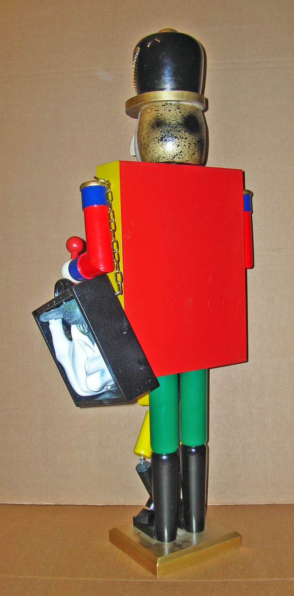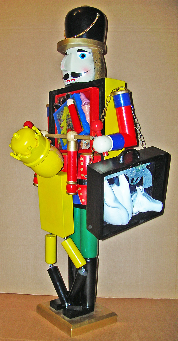 | Titel: Der Erste der Letzten Format (LxBxH): 43 x 38 x 90 cm Entstehungsjahr: 2010 Techniken: Holz-, Metall- und Giessharzverarbeitung, Airbrush Materialien: 3 hölzerne Nussknacker, Plastikpistole, Keramikkuh, Schneckenhäuser und Muscheln, Metall- und Nudelbuchstaben, Kunstrasen, Holz, Metall, Giessharz, Lackfarbe |