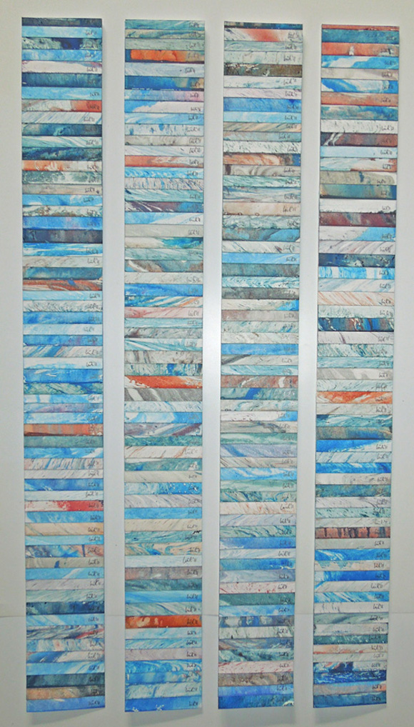 | Titel: Reihung Formate (LxBxH): 81 x 10 x 1,9 cm Entstehungsjahr: 2012 Technik: Collage Materialien: Karton auf Holz ”Reihung“ 39 Arbeiten, im Hochformat 9 x 80 cm, bestehen aus zwischen 50 und 60 ”Bausteinen“ aus der Installation ”Nichtraum“, realisiert 2011 in der mittelfränkischen Stadt Hersbruck. Jeder dieser Bausteine ist eine kleine, mit Öl auf Karton gemalte Landschaft, im Hochformat 9 x 14,7 cm. Jede Landschaft ist ein Unikat, handsigniert und 2011 datiert. Etwa 2.200 dieser Landschaftsbilder waren nötig, um die Wände eines fensterlosen Raumes in Hersbruck, für zwei Tage, durch Überhängung derselben, vom Boden bis zur Raumdecke, völlig zu verdecken und so aus diesem nun Wand-losen, weil Fenster-überfüllten, Raum den ”Nichtraum“ zu bauen. Ein Etwas, das nur noch begrenzt war von Fenstern (die Landschaftsbilder), durch die der „Nichtraum“-Besucher immerwieder andere Dimensionen entdecken konnte. Nach erfolreicher Realisation dieser Installation wurden alle 2.200 Landschaftsbilder wieder von den unsichtbar gewordenen Wänden entfernt und der „Nichtraum“ wieder seiner alten Bestimmung übergeben. Die Bilder wurden wieder verpackt und lagerten, bis zu ihrer Wiedergeburt (in anderer Gestalt), anderthalb Jahre lang in meinem Archiv in Kassel. Jetzt habe ich die Original-Bilder um etwa 1 cm versetzt übereinander geklebt, um so Reihungen in einer Länge von 80 cm zu erhalten. Jedes Original ist jetzt, innerhalb einer Reihung, nur noch durch seinen unteren Rand, meist mit einer Signatur auf der rechten Seite, zu erkennen. Jede ”Reihung“ wurde, nach seiner Entstehung, auf eine geschwärzte, 10 x 81 cm grosse Multiplex-Holzplatte, mit einer Stärke von 15 mm, aufgezogen. Jede ”Reihung“ steht für sich, kann aber auch in einen Dialog mit anderen Reihungen treten! |