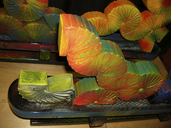 Jedes Schiff steht, zu seiner Sicherheit und zur Präsentation, auf einem, ihm entsprechenden Fuss bzw. Ständer. Inclusive diesem Fuss, hat ein jedes Schiff, mit Passagieren, eine Länge von 61 cm, eine Breite von 12 cm und eine Höhe von 43 cm. Die Schiffe und ihre Ständer bestehen aus Holz, die Passagiere sind aus Karton. Verbunden sind Schiffe und Passagiere durch transparentes Giessharz. Überarbeitet wurden alle Elemente, ob nun Schiffe, Passagiere oder Ständer, einzeln und unabhängig von einander, mit der Technik des Airbrush auf Lackbasis. Danach erst wurden die Einzelteile einander zugeordnet und mit einander verbunden.